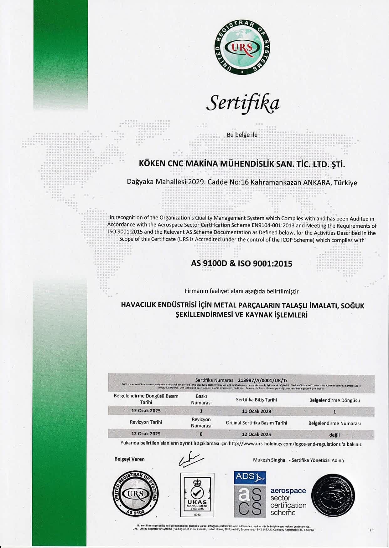 Köken CNC Makina Mühendislik Şirketi, Ankara İvedik sanayi bölgesinde talaşlı imalat sektörüne adım atmış ve 2023 şubat ayında Kahramankazan organize sanayi bölgesindeki 1300 m2 fabrikamızda yüksek kalite standartlarına uygun 20 yılı aşkın uzman personeller ile devam etmektedir. Firmamız sahip olduğu gelişmiş son teknoloji makine parkuru ve alanında uzman teknik kadrosu ile talaşlı imalat alanında etkin çözümler sunmaktadır. CNC torna ve freze işleme merkezlerimiz ile savunma sanayi, havacılık, otomotiv, medikal, yedek parça, inşaat, makina, beyaz eşya, elektrik, enerji ve kalıp sektörleri başta olmak üzere bir çok sektöre AS 9100 kalite standartlarına bağlı kalarak üretim yapmaktayız. Sahip olduğumuz makinalar ile imalatlarımız yüksek hassasiyet, yüksek üretim hızı ve esneklik gibi avantajlara sahiptir.